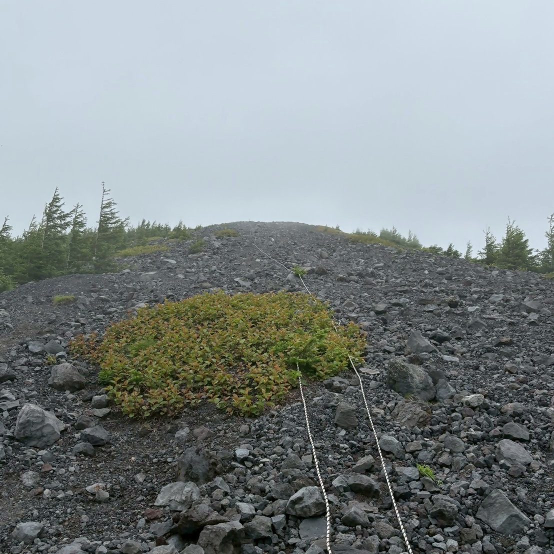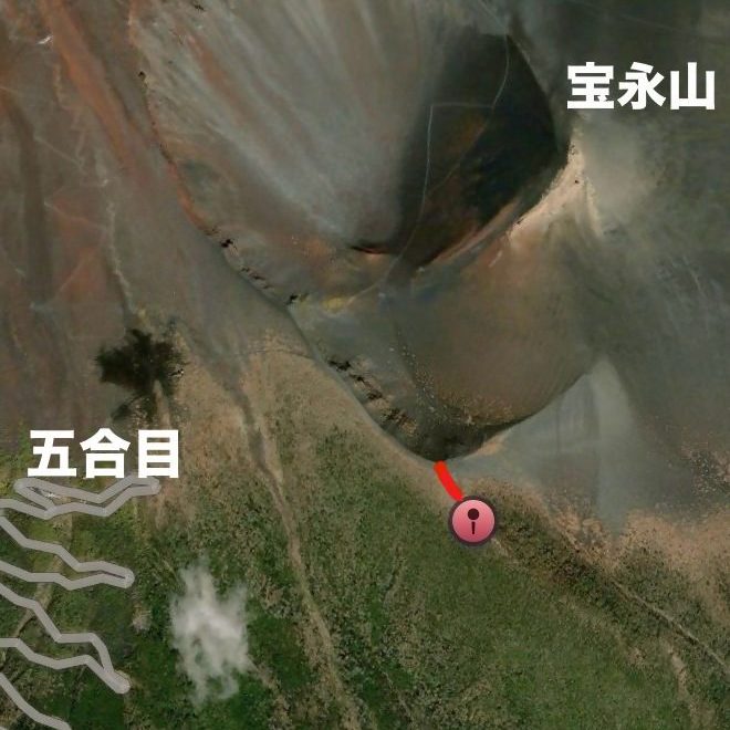 この写真の坂は地図上の赤線のところです。この坂を登りきると右手に宝永火口が見えてきます。