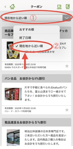 ③まずは①を開きます。その次に「現在地から近い順」をタップ!土地勘がない方でも簡単に近くのクーポンを調べることができます!