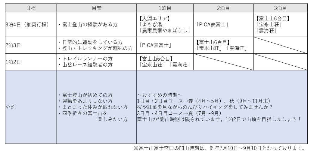 「富士山登山ルート3776」は全長約42km、標高差3776mの過酷なルートです。3泊4日での挑戦を推奨しておりますが、下記の情報を参考にご自身の体力などに合わせて日程を決めましょう。また、連続した日程でなく、複数回に分けて挑戦しても問題ありません。